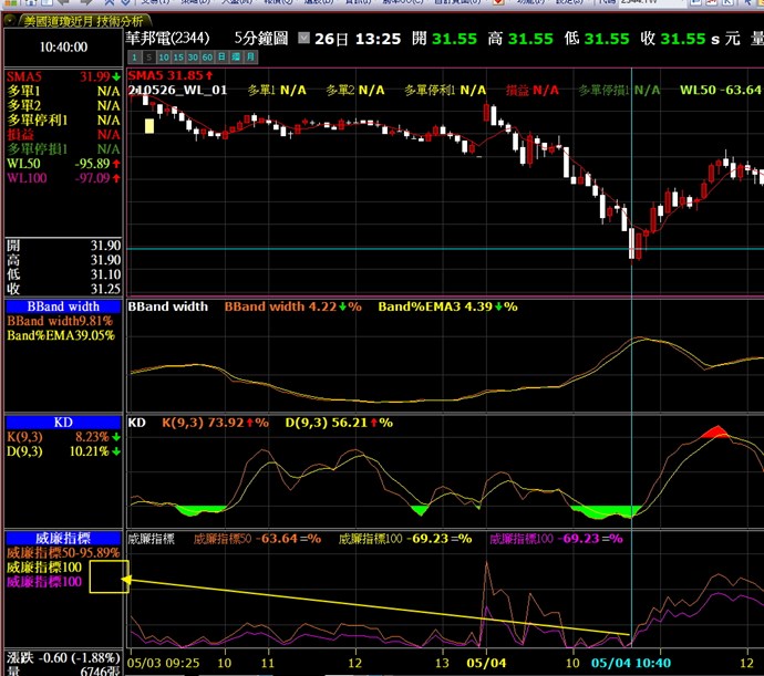 請問一下,XQ內建的威廉指標數值如下,在威廉100時內建的會「沒有值」,請問這可能是什麼原因呢?