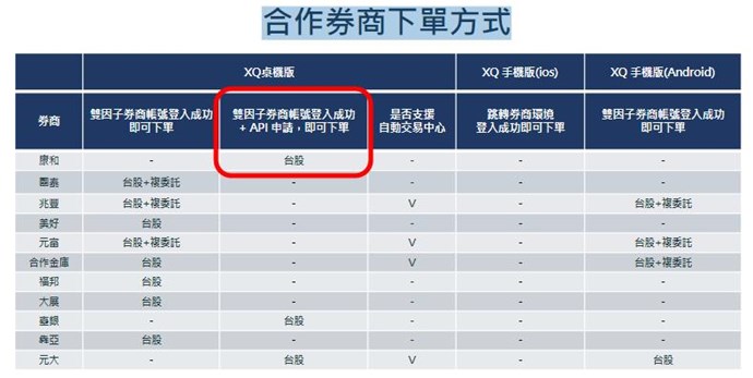 參考:【XQ 全球贏家與合作券商下單串接合作模式】