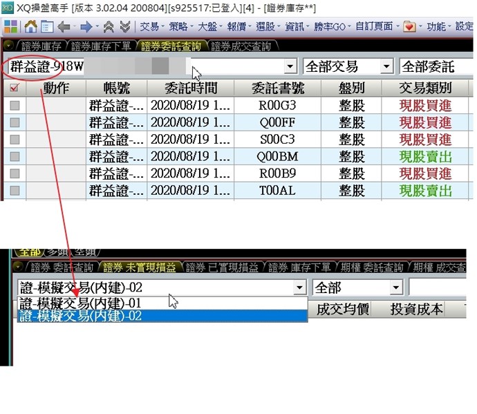 您好,XQ帳務功能目前僅支援系統的模擬交易,券商交易功能部分目前僅提供即時交易資訊。