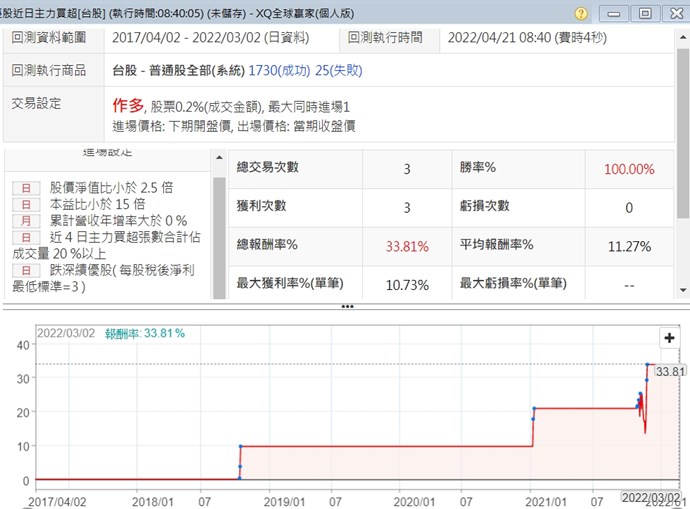 回測期從2017到現在,只有出現過三次交易,也沒有出現文章中提及的那三檔股票