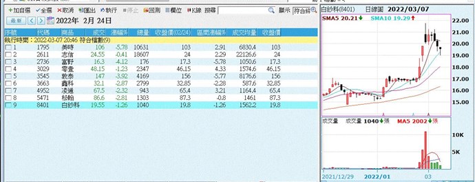 如下圖,選股時,往前回朔日期(02/24)觀察,但右方顯示的圖,無法直接得知2/24是哪根K棒,
