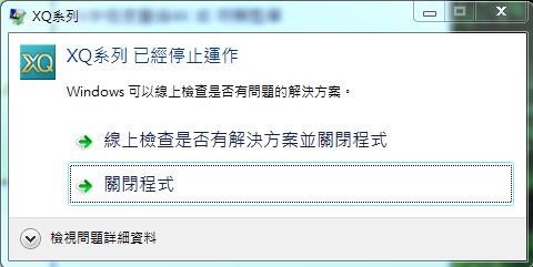 另外關閉XQ時,常會出現XQ系列已經停止運作的畫面,無法順利關閉,也請一併協助排除。
