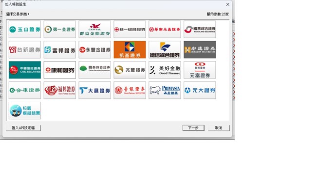 「加入帳號設定」的視窗,選擇交易券商的最左上角就是玉山證券。