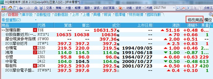 2.請由XQ自選股的「修改商品」進入自選商品組合,並點選畫面上的「匯入」按鈕。選擇匯入然後選擇您要匯入的商品組合檔案即可。