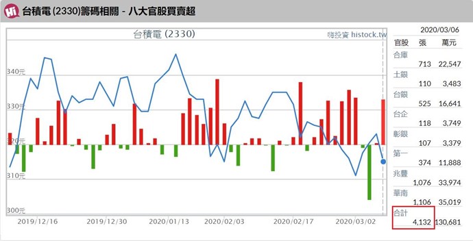 我比對了三家網路數據,差異蠻大的,3/6 2330 台積電,八大官股買賣超應是4000多張,為什XQ顯示買賣超1915張(如我一開始所附附件)?