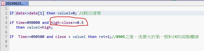 我想要在突破五分k的第一根k棒高點發出訊號 拿掉紅色的部分跑出的結果是對的 但只要加上第一根k棒高到收5tick的條件 high-close>=0.5 跑出的結果就會不對 卡在這邊很久 所以上來發問 謝謝