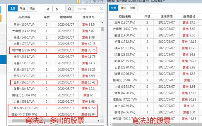 寫法三回測選到的股票,在寫法1,2都會有,但寫法1, 2會多出一些股票