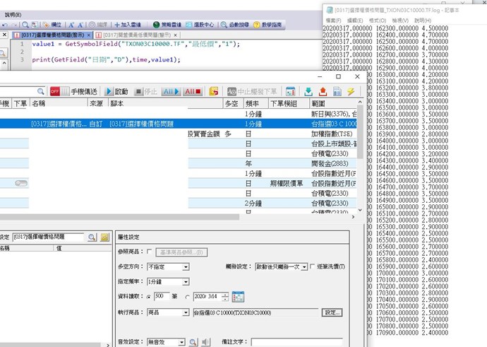 了解 ,因為已經先截圖了,那我就再把情況告知一下,我的執行商品是只有台指期,沒有選擇權,因為我是要腳本內抓取選擇權數據