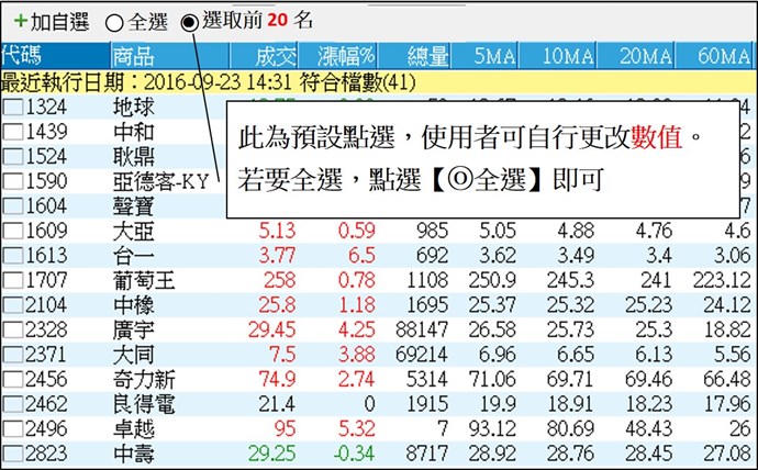 例如,寫了三個計算條件,且每次數值變化很大,希望選出「第一條件的前5名」or 「第二條件的前10名」or「第三條件的前20名」。目前僅能將計算結果,匯出成Excel檔,分別排名後,再手動一一的輸入自選股裡,很費時,也很古老的方法。拜託了!