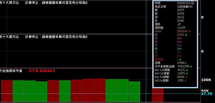 最近日盤後的當天都會出現這種問題,沒有直條圖的那天就是今天(3/22),顯示為0。上面的"前十大買方比"和"前十大賣方比"皆是用未平倉當分母,所以出現錯誤