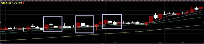 1.長期多頭緩漲(長期在月線上)(五日均十日均基本不會急跌破)