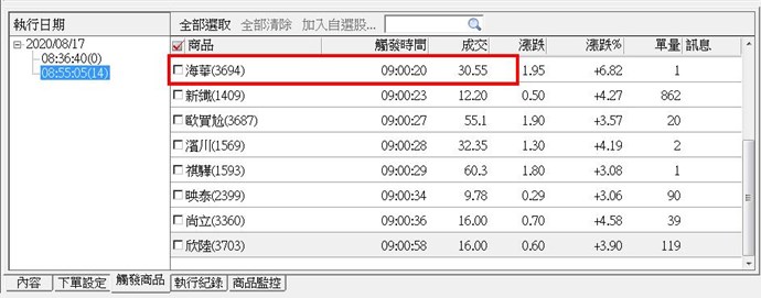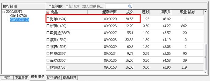 只要開盤價搓合那一瞬間買進策略被觸發,內盤五檔無單而掛單設定是觸發價負數檔數