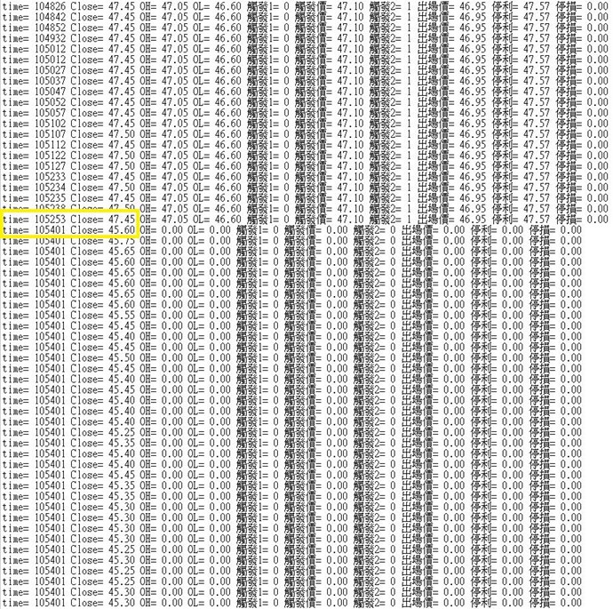 黃框中顯示時間105223時 CLOSE=47.45,到了105401時 CLOSE突然跳到45.6(正確應為47.6)