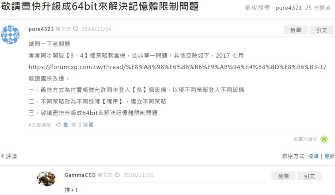 您好,您在 2018/11/26 有反應 XQ 記憶體不足的問題,我們有嘗試做出一套新系統,以利解決此不便的情況,若您有興趣可參考以下此連結,先行體驗試試看,謝謝。