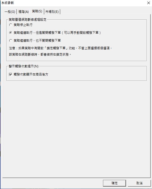 系統預設會是,當策略雷達網路斷線後重連,會使策略持續進行但是關閉觸發下單。