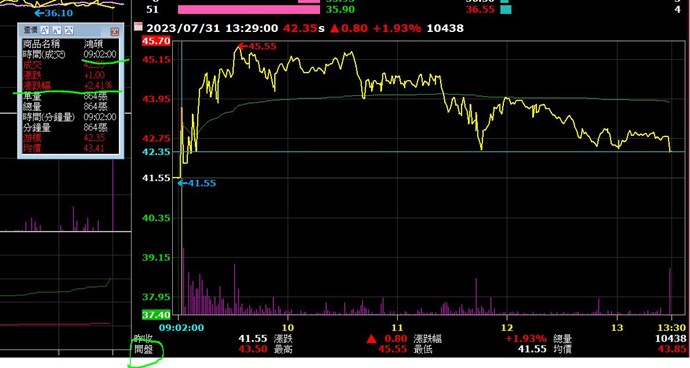 然後如下,應該是開盤是43.5,只是該分鐘結束已經跌到 2.多%
