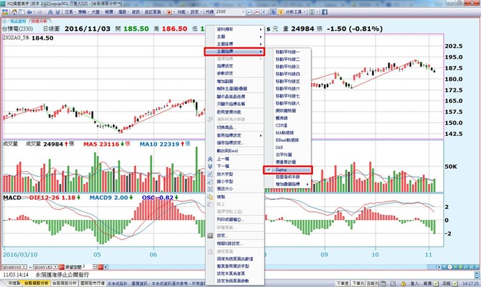 1、在主圖上面點滑鼠右鍵,選擇[主圖指標],可以看到所有可以加入的主圖指標,我們可在此加入「ZigZag」指標。