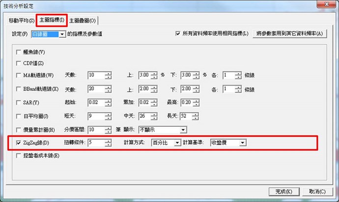 2、如果您想調整ZigZag指標內容,可以在主圖上再點選滑鼠右鍵,進入[指標設定],在第二個"主圖指標"頁籤可以對ZigZag指標的參數來自行修改,最後按下完成。